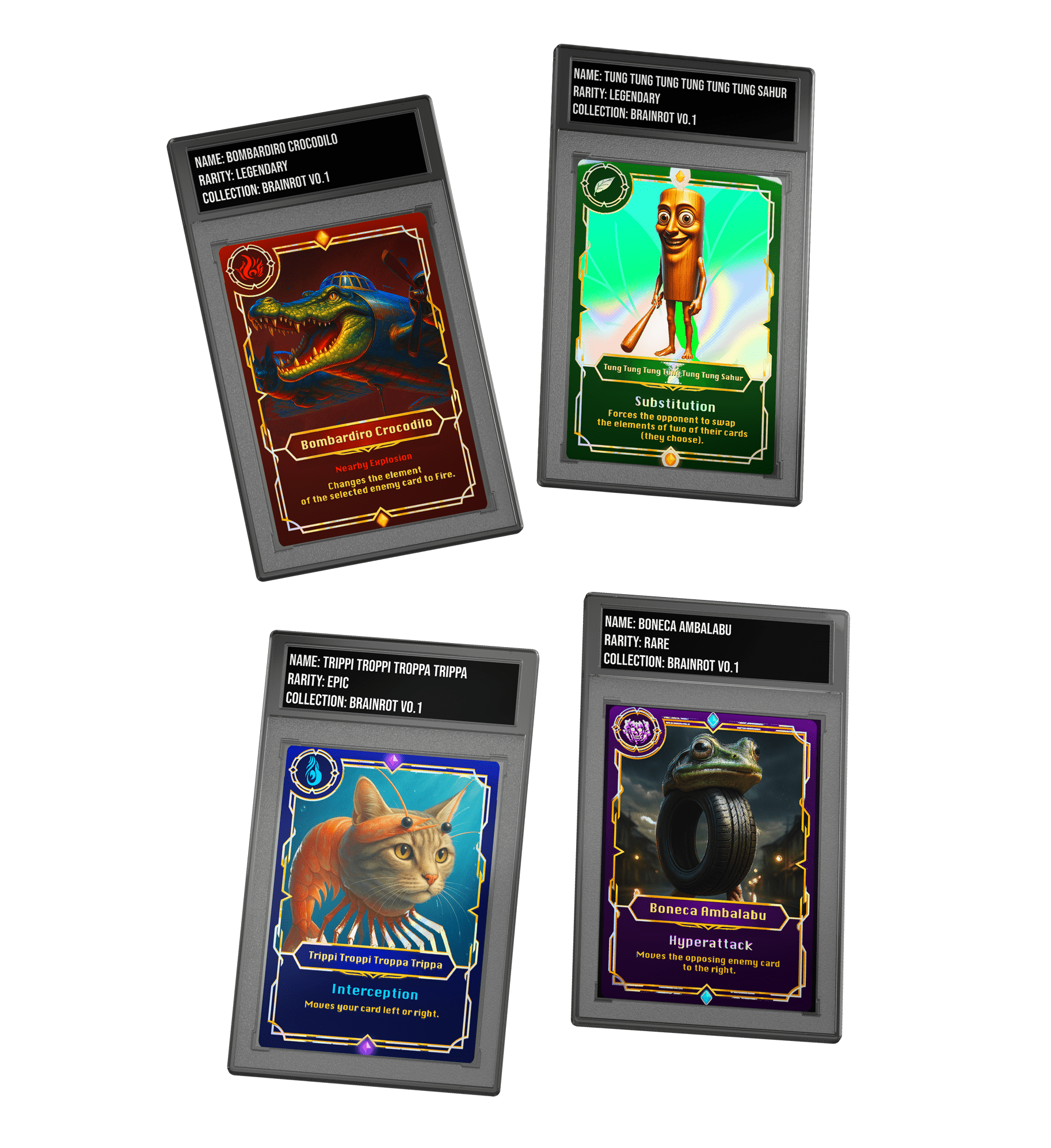 Brainrot is a fast-paced, collectible battle card game featuring Brainrot Characters and Abstract Entities.Each card features an Element and a unique Skill. Elements follow a 5-element wheel, where each beats two others.Players build decks and battle 3v3 using elemental matchups and strategic skill plays.The full game will be developed and released once 100% of the packs are sold. We're launching as an on-chain game on the Abstract network, with plans for a physical release to follow.